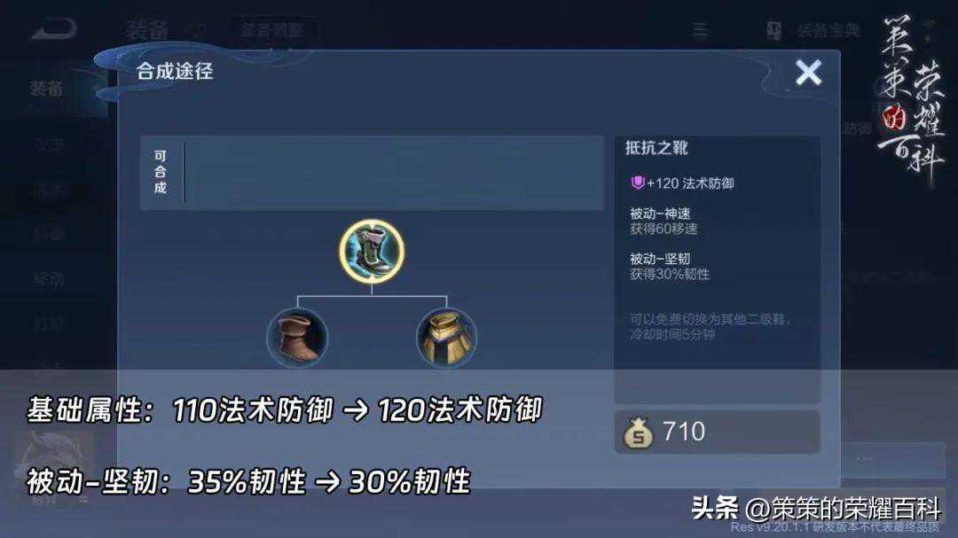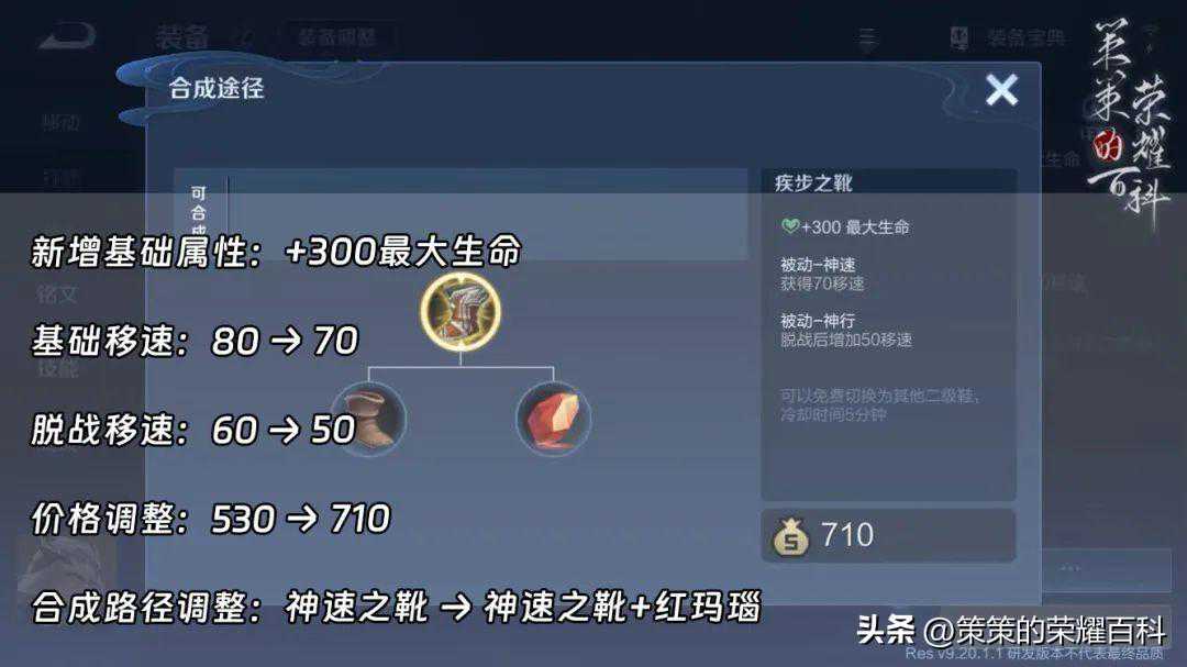 解读:1、疾步之靴进行了一次全方位调整,先是上调了装备价格至710g,与其他二级鞋统一;再新增300最大生命,并调整了合成路径;最后,基础移速、脱战移速分别削了10点。