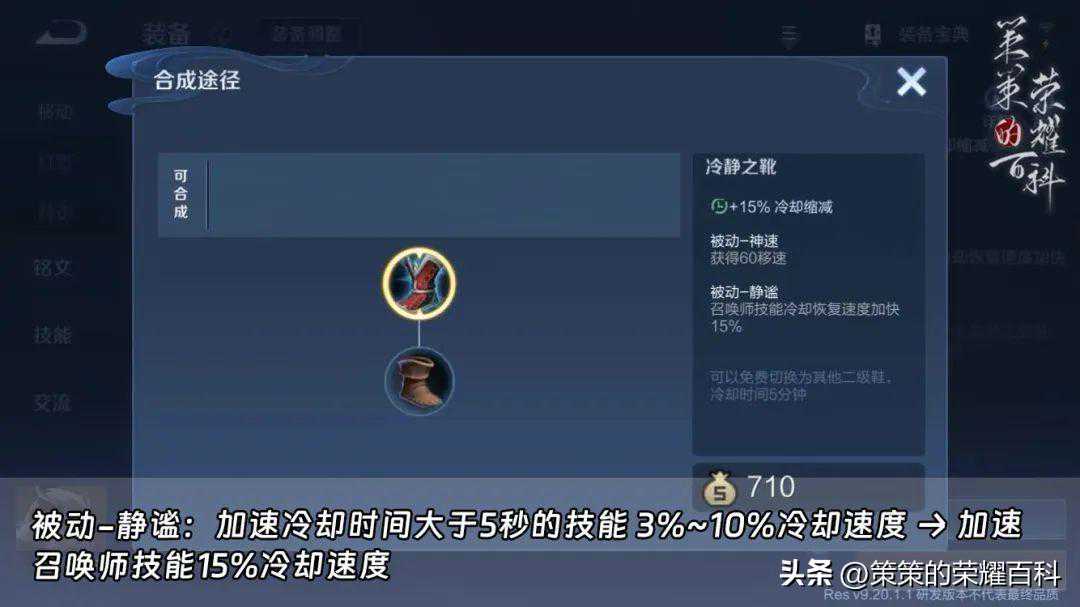 2、技能冷却的影响因素,除了调整前的冷静之靴,还可通过调整装备、铭文来精准卡冷却;而召唤师技能的冷却,现版本没有影响因素。
