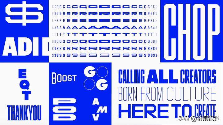 2018年,洛杉矶设计工作室MCKL为运动品牌Adidas设计了一套可变字体AdineueChop。AdineueCHOP是一种以八角形为设计形态,由多种宽度和重量构建而成的无衬线动态字体,它的可变范围无限广,从CrazyLight到UltraBlack,从XXNarrow到XXWide都可以实现。