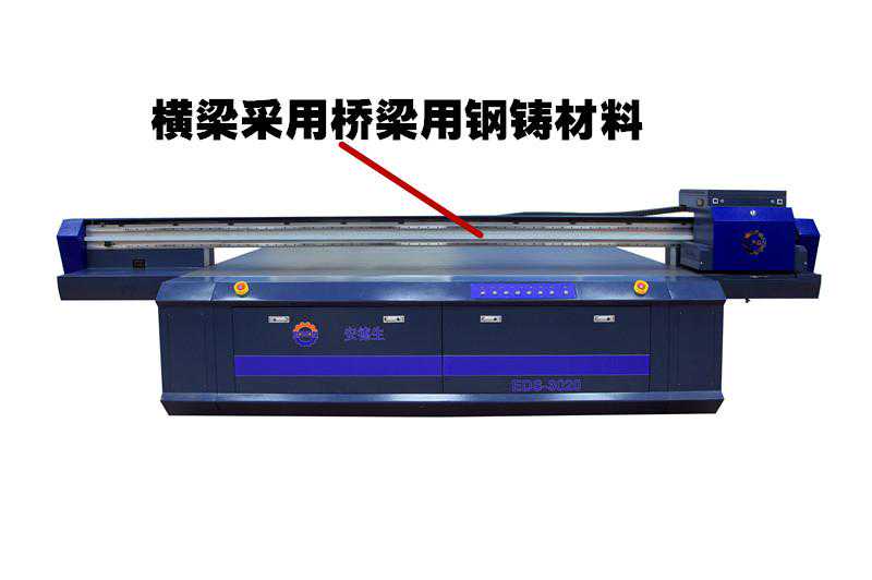 安德生厂家设备横梁材料采用桥梁用钢铸材料,材料硬度到达行业最高标准,在标准重力下,永不变形。我们都都知道理光G5uv打印机打印车头比较大,有一定的重量,如果不采用好的材料作为横梁,设备横梁就容易向下弯曲变形,严重影响设备性能和打印效果。