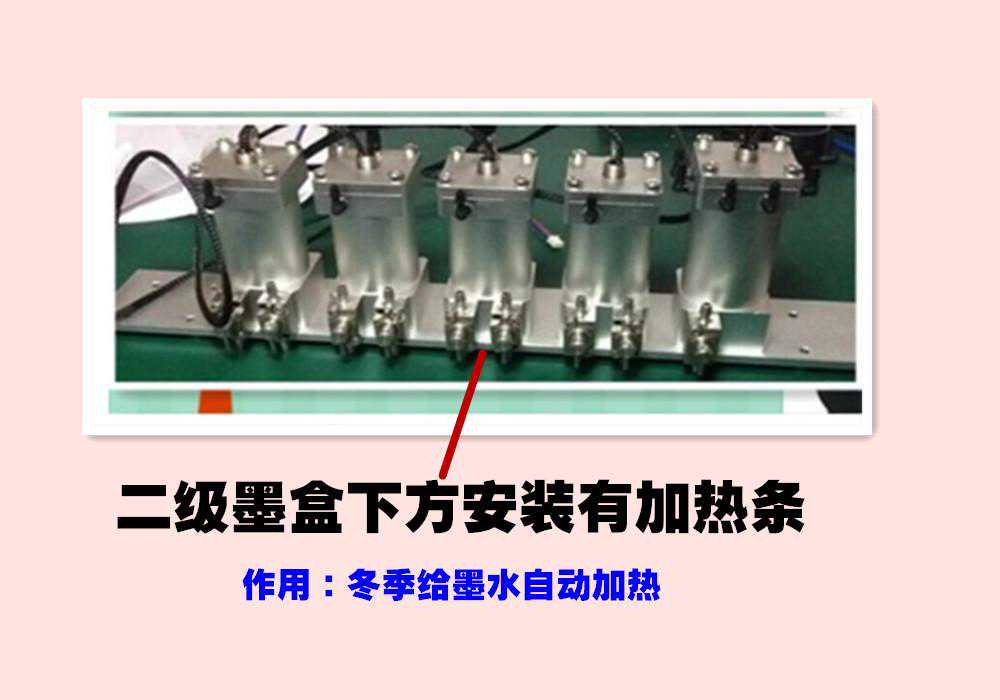 为了设备在低温的季节能够正常使用,安德生理光G5uv2513打印机还另外在二级墨盒上配置了加热装置(如上图)。一级墨盒和二级墨和给墨水自动加热。大大的提高设备综合性能。