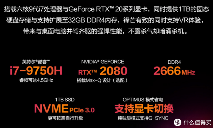 以顶配版本为例,i7-9750/RTX2080/240Hz/32G内存/1TB固态/15.6英寸IPS144Hz72%NTSC色域,厚度仅为1.79cm,铝合金外框,重量仅为1.9KG。