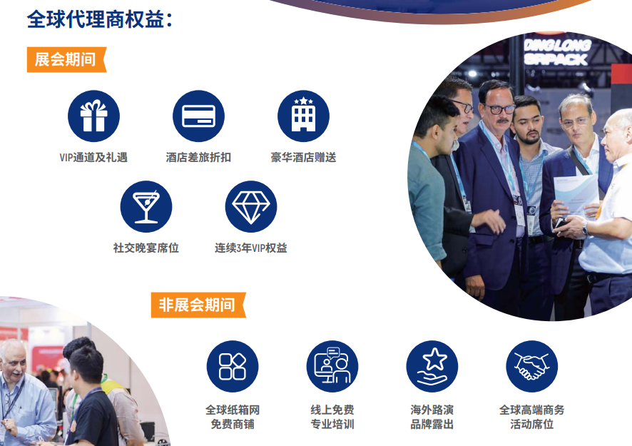 非展会期间:全球纸箱网免费商辅、线上免费专业培训、海外中演品牌露出、全球高端商务活动席位。