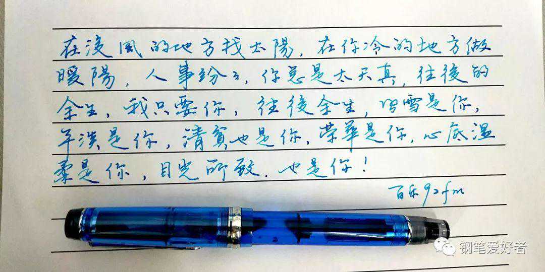 74和92都是百乐5号尖,笔尖和笔舌都是一模一样,只不过74尖是金色,92尖是镀銠银色。但是为什么s的就会软点呢?根据我肉眼和放大镜观察,发现74sm的金片比92fm的要薄三分之一,同款笔尖,金片薄的肯定要软一些。92fm是在2018年春节买的,当时听说这款笔写感不错,又是百乐唯一的活塞笔,硬是加价顺丰邮费买下(性子急,等不了),上手后果然没让我失望,硬弹顺滑流畅,相比写乐21k难控的软写感(有人说21K硬,其实21K确实定位是硬写感,因为是H-MF,这里的H就是代表hard硬,只不过国内一直没有看见过S的,听说日本有)和白金3776那紧绷感的硬,这支92fm完全不用去适应,顺滑却又能恰到好处地控制笔画,让你有一种久别重逢的感觉,到目前为止,我个人认为这支笔的写感比龙146f还好写,所以每当有人问起入门金笔买什么,我都是首推百乐74(因为74比92便宜200+)。但是因为是fm的关系,在笔画的冲击力上肯定没有粗笔画来的强烈。附上笔迹图,字一般,勉强看看就好。(墨水:百利金土耳其蓝,纸张:A4,格子大约1.2cm)
