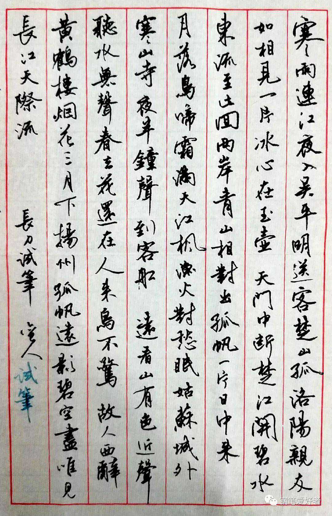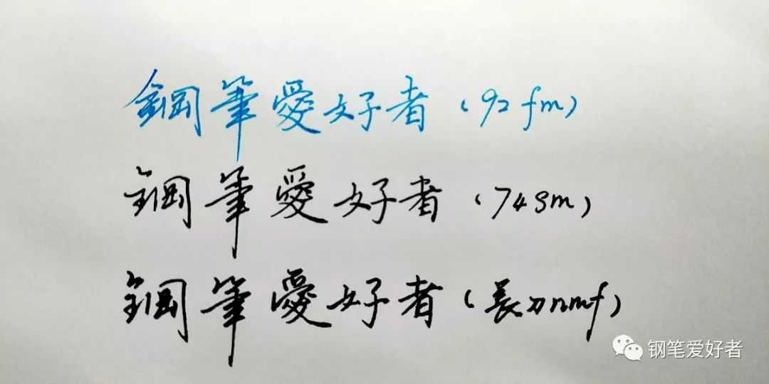 nmf是比较多人买的型号,长刀研一直是评价两极化的笔,争议颇大,不适应的人很多,很多人买后试写几个字后就转出手了,主要原因是笔画很粗,难以控制笔画粗细。2018年国庆期间,一笔友寄来给我试写了三个月,很奇怪,我一上手就能适应,而且感觉容易控制,我想可能和我读书期间经常用美工笔关系很大,长刀绵一样的软弹,糯滑的写感让人提笔后欲罢不能,伴随“沙沙”的书写声音,无法停下手来。还笔之后,对此笔的写感一直念念不忘,夜不能寐,正值老长刀停产,价格飙升,但是还是忍不住高价买了支全新鱼雷长刀。其实长刀的个体差异还是很大的,可能和手工打磨有关,我买的这支和笔友的还是区别很大,金片比那只薄,增加了弹性,“沙沙”的书写声音居然没怎么有了,带来是更顺滑的写感,依然让人着迷!附上笔友用这支长刀的笔迹图(估计我这辈子也无法写出和他一样漂亮的字的)。