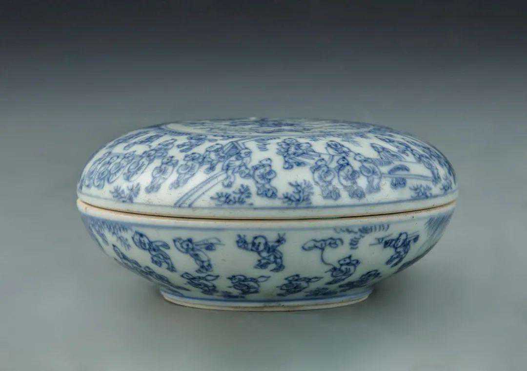 青花淡描百子图印盒赏析