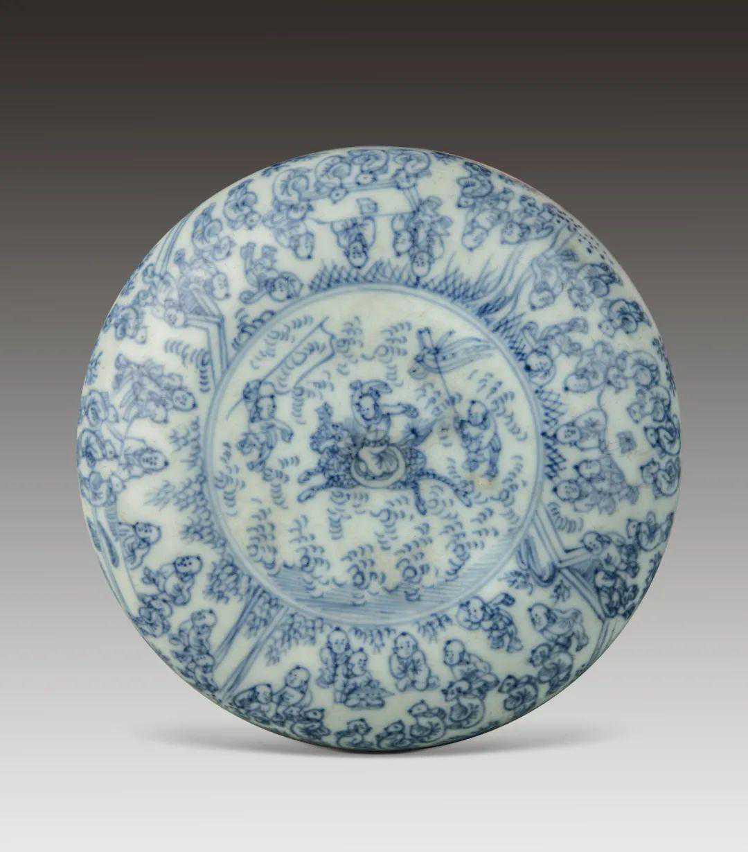 的场景,如“百子图”、“婴戏图”等。瓷器上的婴戏图最早兴起于唐代长沙窑,盛行于宋代,随之被广泛用于各大名窑。“六一”是孩子们的节日,今天请随我们一起欣赏这件清华大学艺术博物馆收藏的青花淡描百子图印盒吧!