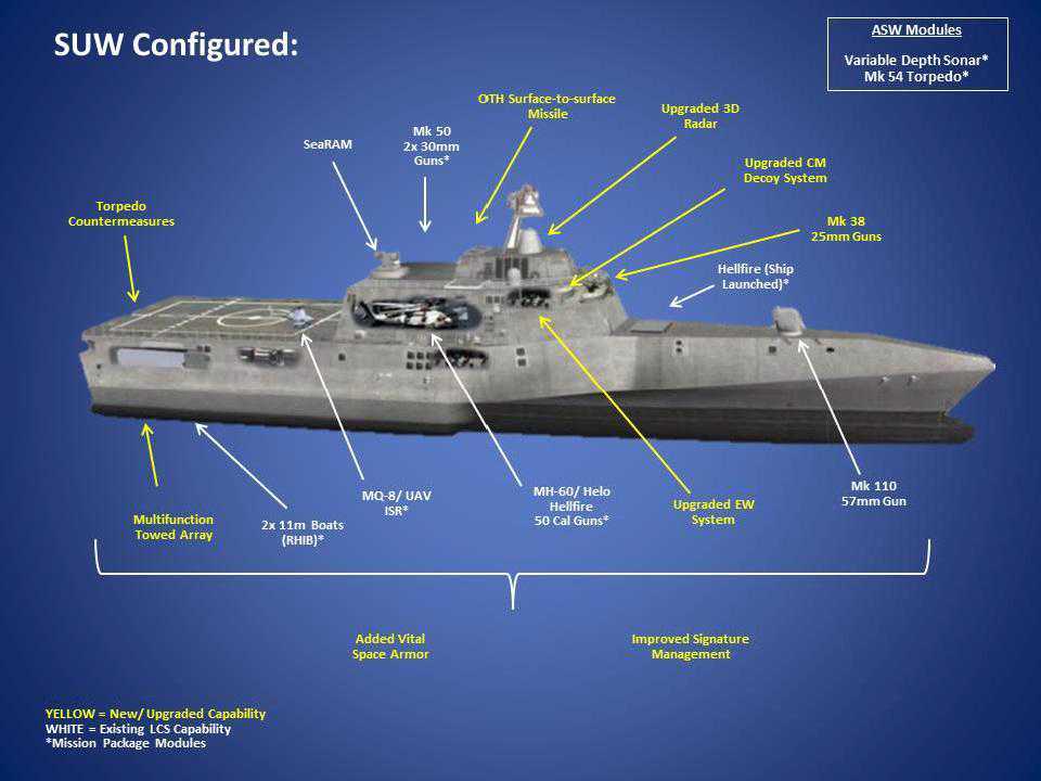 报导说,布林豪弗上尉所指的是同一时间执行反潜和水面作战任务。因为新型护卫舰将装备反潜水面作战系统,包括声纳、超视距导弹(Over-the-horizon)以及地对地武器如30毫米炮和地狱火(Hellfire)等短程导弹。该护卫舰研制项目经理丹•布林豪弗(DanBrintzinghoffer)上尉说:“该舰艇能够同时进行两项任务,具有很强的灵活性,可在各种情况下发挥各种性能。”