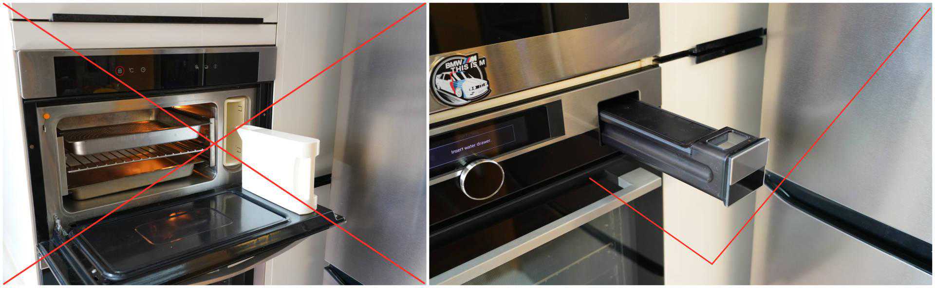 ▲这是一个很重要的使用体验:我现在家里的蒸箱是内置水箱,缺水需打开舱门,这样会迅速降温破坏正在烹饪食物的口感。而且内腔高热蒸汽容易被烫伤,加上蒸汽外泄,还需重新注入蒸汽、耗时耗能。外置水箱则无需担心这些问题。缺水时直接取出水箱即可,简单方便。