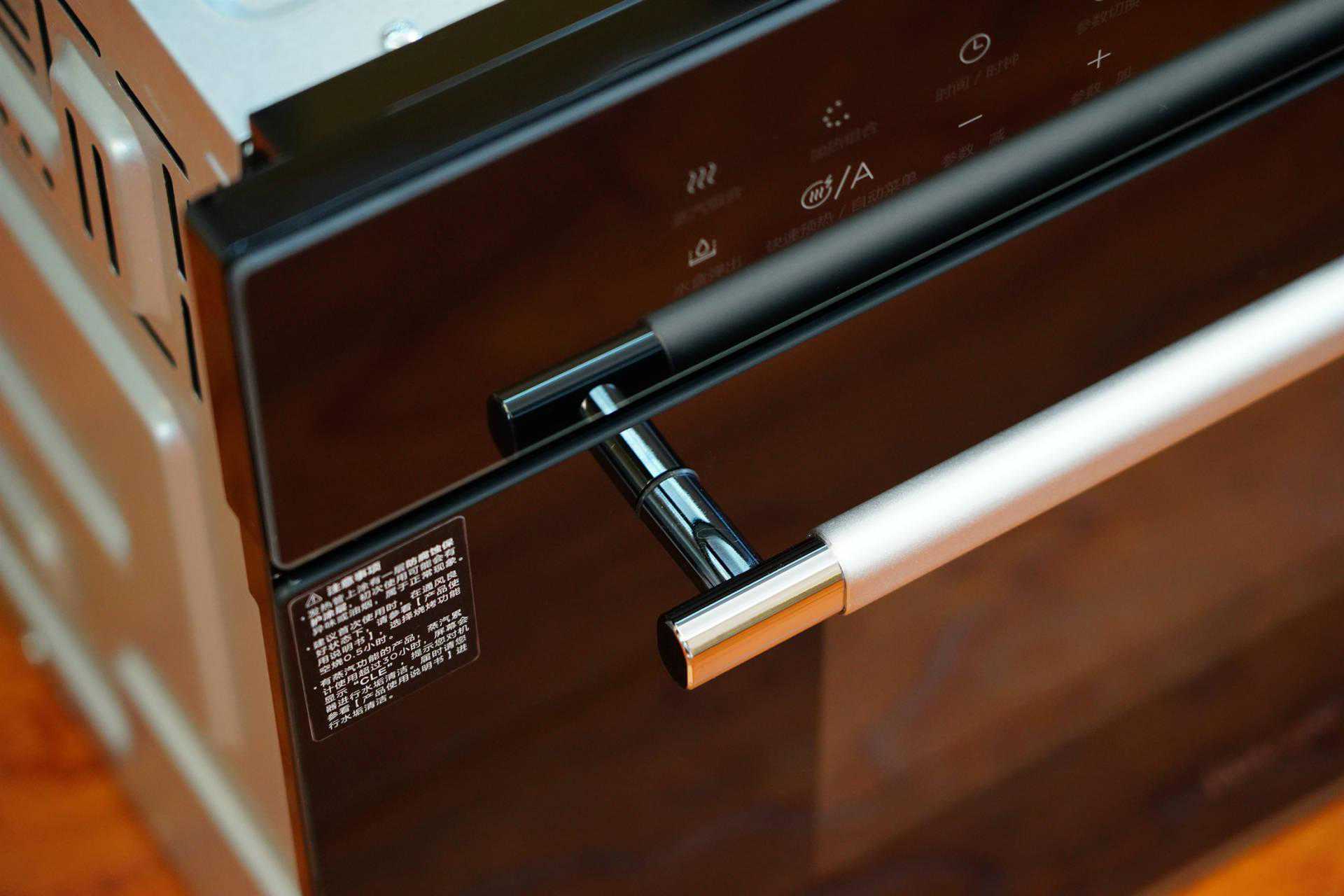 ▲华凌HD300蒸烤箱的炉门把手采用的是两侧金属镀铬。镀铬材质不光颜值高,增加美观性;还有其化学性加强了把手的耐久性。中间磨砂防烫设计,握感一流。