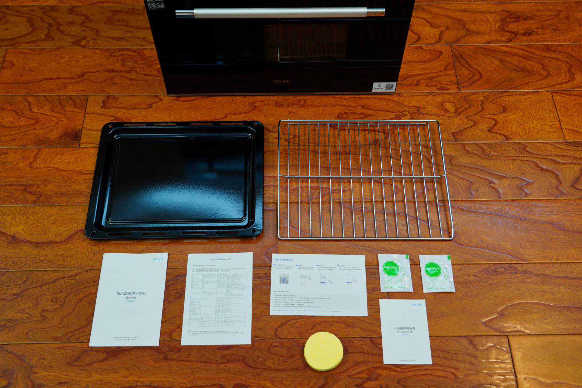 ▲华凌HD300装箱清单包括一个烤盘、一个镂空烤架、两包柠檬酸除垢剂、说明书和APP绑定说明。