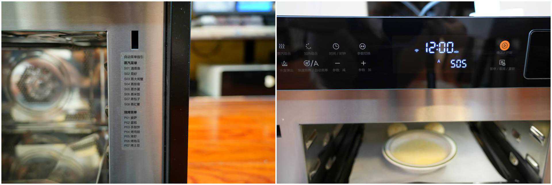 ▲自动菜单指引贴于腔门分蒸汽和烧烤菜单。比如这边我需要蒸水蛋,只需选择对应的S05模式即可。系统会根据菜肴自动选择时间和程序进行烹饪。