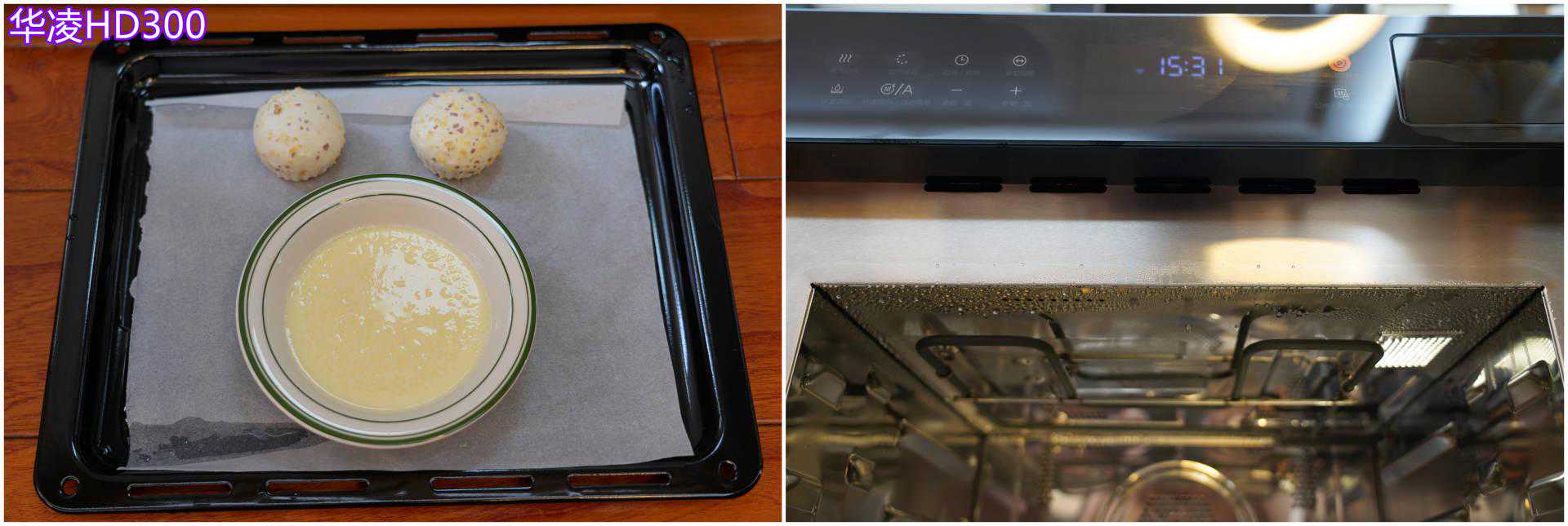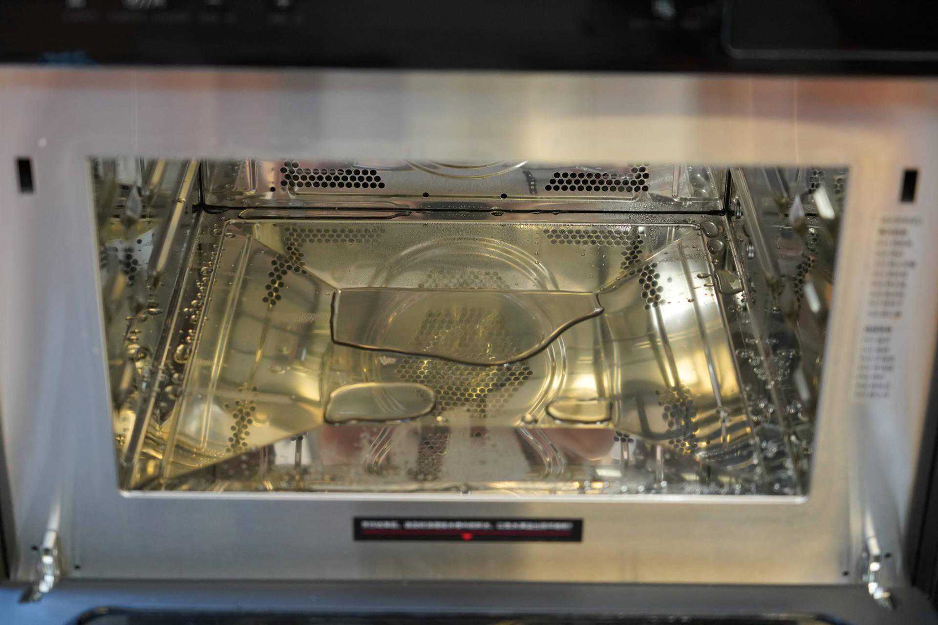 ▲华凌HD300在炉门附近会有冷凝水产生。所以食材摆放尽量避开最外侧。后面不会有水滴落。