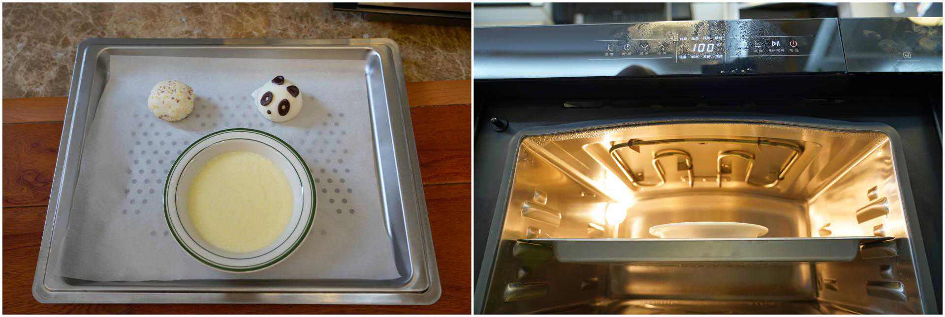 ▲传统烤箱无蒸汽发生器,所以需用“水浴法“来提高内腔湿度,使蛋糕表面不至于在高温、低湿下开裂。而蒸烤一体机则无需在托盘中加水哦!
