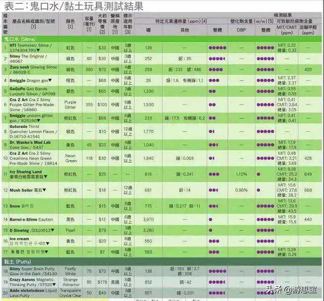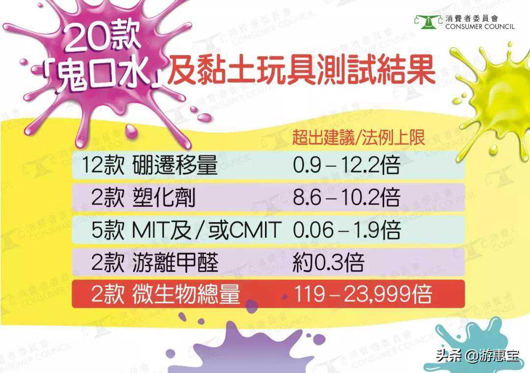 香港消委会测试17款「鬼口水」(slime)及3款黏土(putty)玩具,售价由HK$7至HK$178不等,发现七成「鬼口水」样本的「硼迁移量」超标,最多者更超标12倍,亦有2款样本检出微生物总量超标,最严重者超标23999倍,可能会影响健康。