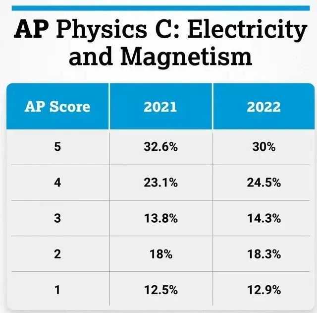 今年来看,AP物理C电磁学的5分率为30%,和去年相比降低了2.6%。