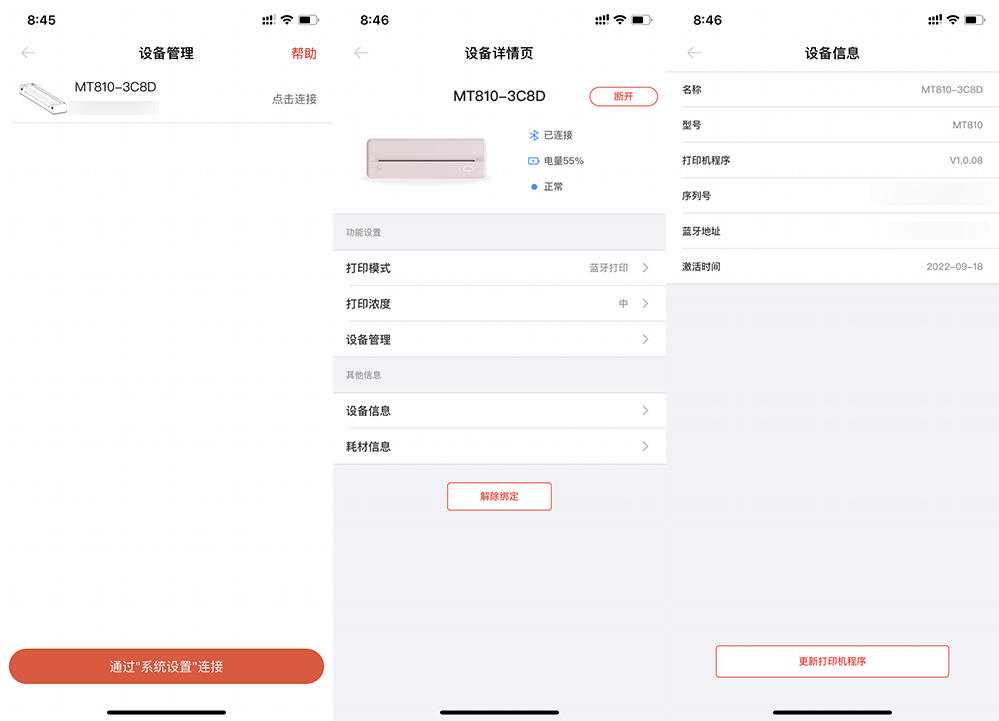 不过汉印MT810最常用的场景肯定是通过手机来打印,毕竟现在文件大都是通过聊天软件来传输,所以一个好用的APP是非常必要的。这段时间的使用我觉得“汉小印”APP做得还挺好,不仅功能全面,而且设备首次适配、绑定也很方便。