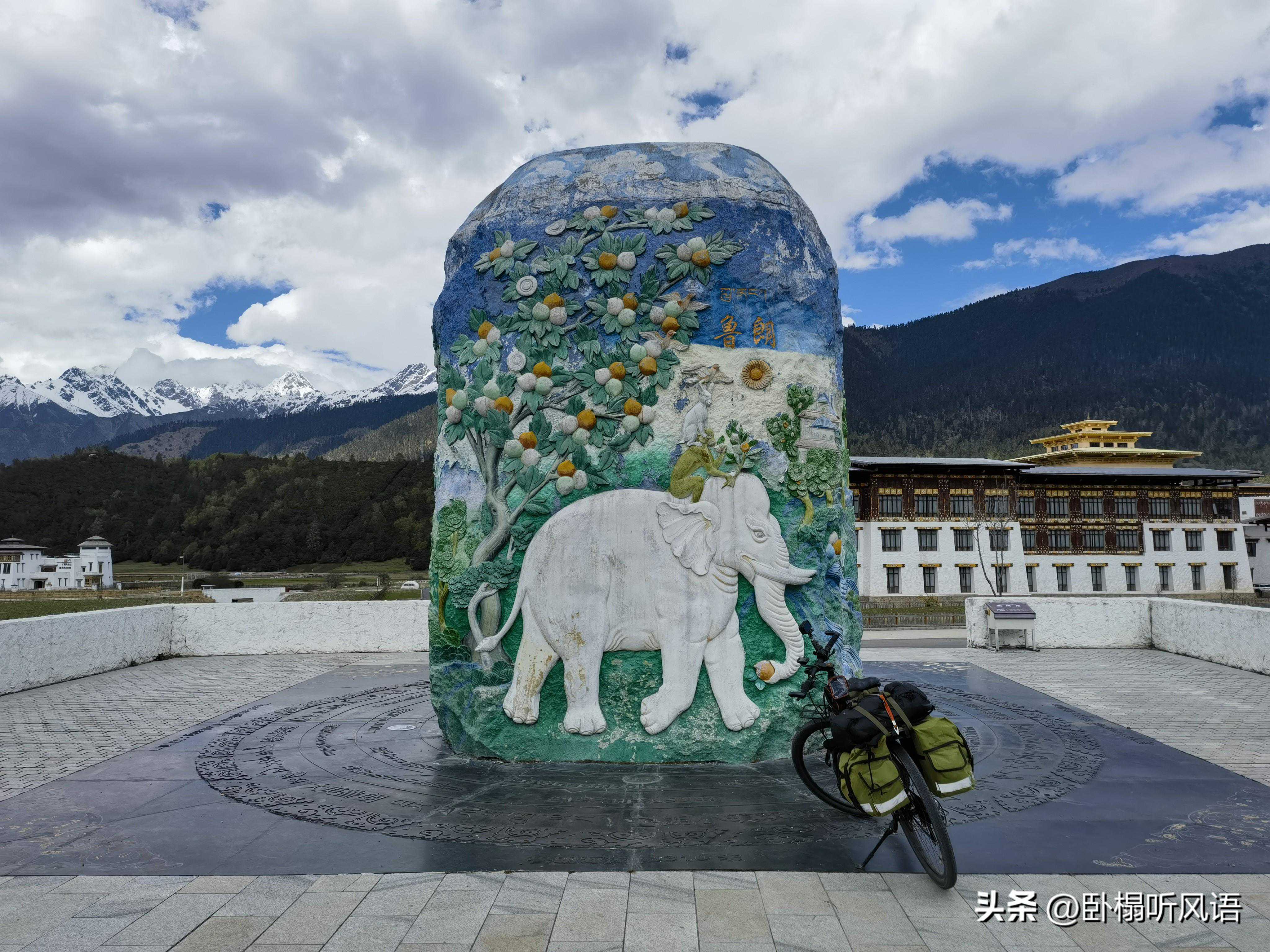 过了援藏展览馆再往前走不远,过了一座桥,马路左边有一座五颜六色的大石碑,雕刻着鲜花、白象,写着“鲁朗”。石碑下面的地板写着鲁朗的海拔,以及鲁朗距离北京、上海、巴黎等地的直线距离。