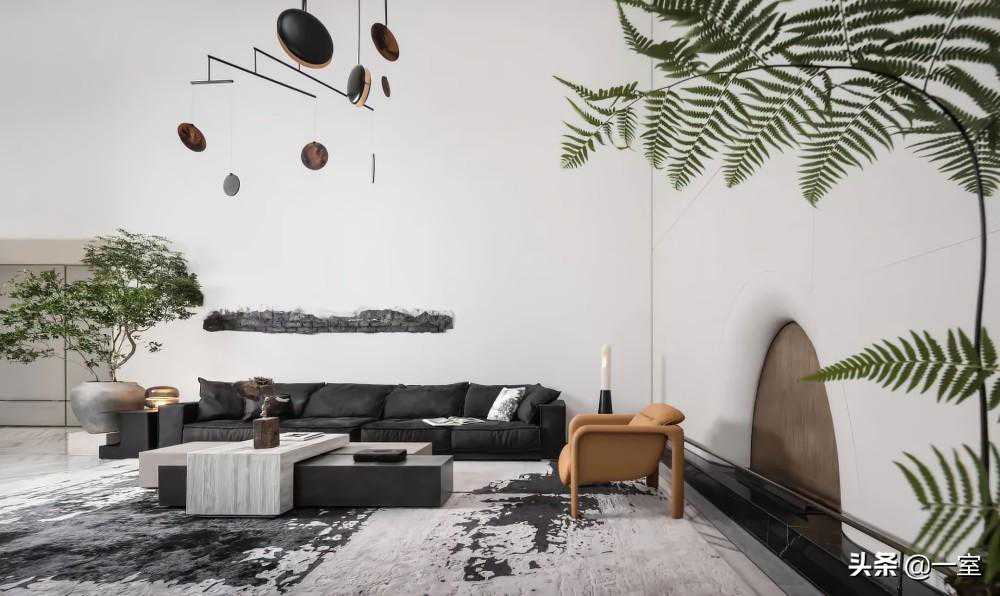 挑空开放的门厅及客厅,家具陈列呈现不规则形态,像艺术品一般来进行陈列。墨黑的沙发、巨型水墨地毯、墙面的纸墨装置,都阐述出了东方美学的水墨文化。
