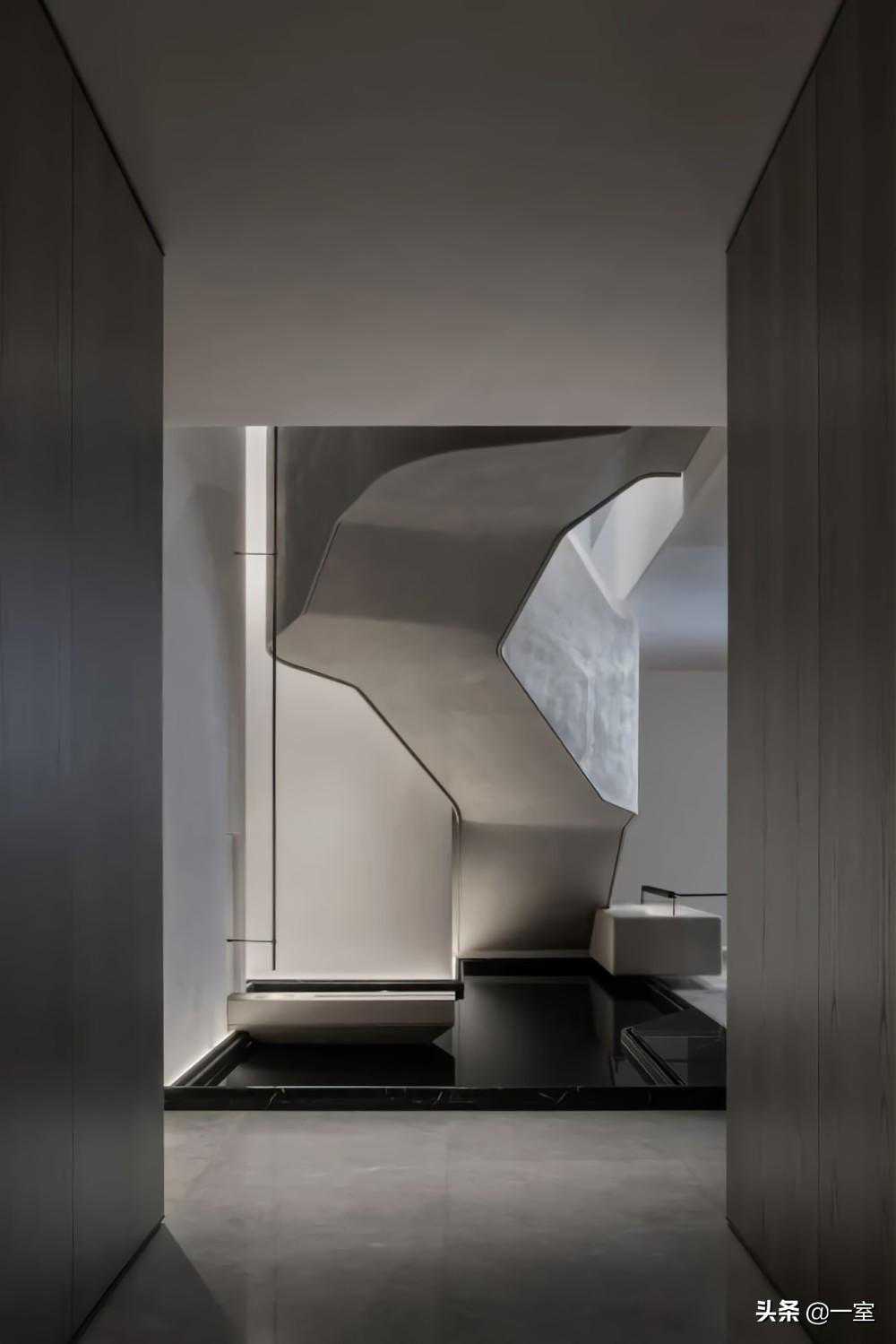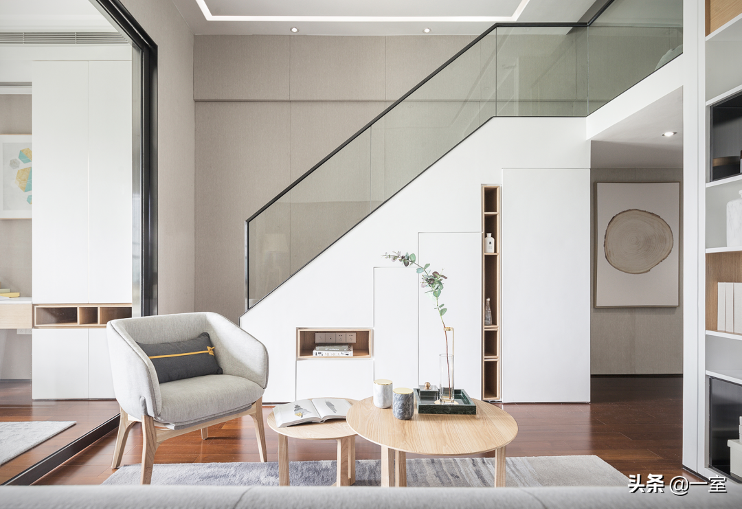 楼梯在空间中除了满足必要的功能,还像是一件艺术品,具有装饰性,丰富了空间层次。