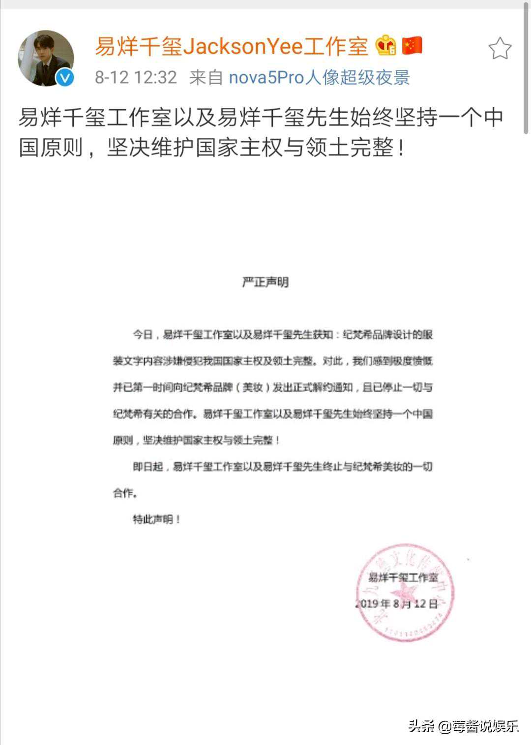 还是8月12日,易烊千玺宣布与纪梵希正式解约,停止一切合作,并坚决维护一个中国原则,坚决维护祖国主权与领土完整。