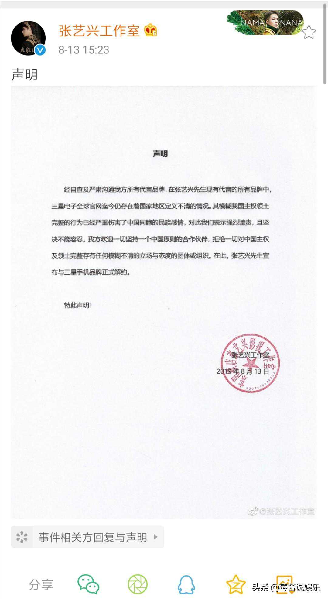 8月13日,张艺兴针对三星官网对中国的国家地区划分问题不清并且无改正意向的情况下,也宣布与三星解约。