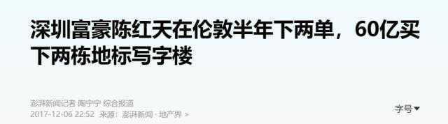 2017年,中国首次超过美国,成为英国房地产市场的最大买家。陈红天的祥祺集团,也在这一年重金投资了英国商厦。