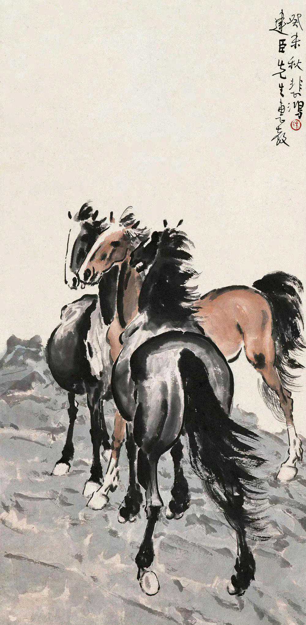 右上角落款“癸未(1943)秋悲鸿,建臣先生惠教。”配合落款的,只是一方朱文单字小印“徐”。这种用印的方法,较多的被画家使用,实际上是因为绘画作品中色彩元素比较多,红色的印章往往起点缀作用,使用姓印,往往与落款配合,保证。