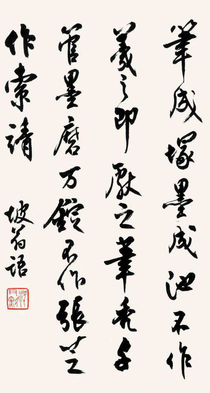 沈尹默这幅书法作品,左下角落简款:“坡翁语。”钤盖一方朱文印“沈尹默”。“笔成冢,墨成池,不及羲之即献之;笔秃千管,墨磨万铤,不作张芝作索靖。”是苏东坡《题二王书》中的句子,所以说是“坡翁语”。