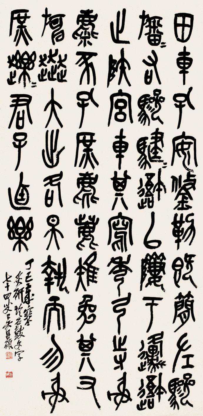 左下落款:“丁巳(1917)年岁寒,炙研珍石鼓文字,七十四叟吴昌硕。”钤印两方,上一方朱文“俊卿之印”,下面一方白文“仓硕”。上面的这方“俊卿之印”就是“名印”,俊卿是吴昌硕的名。