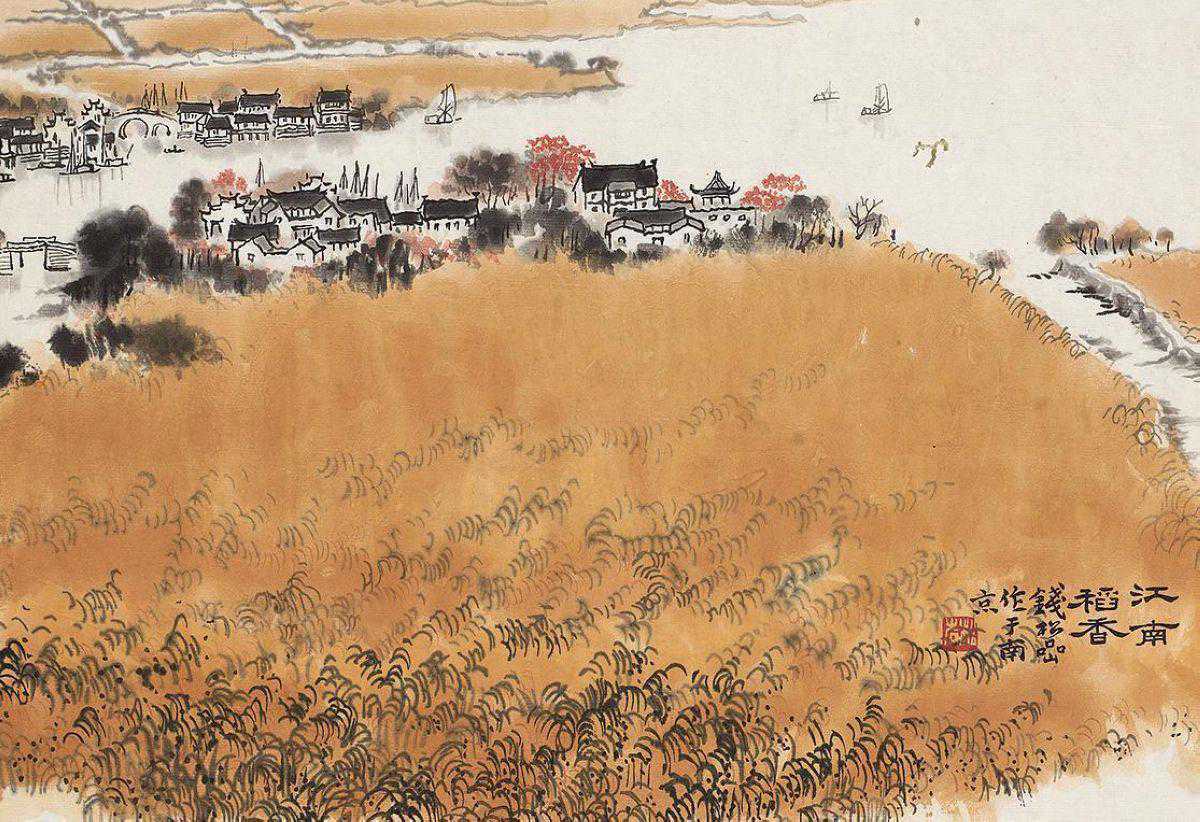 右下的落款:“江南稻香。钱松岩作于南京。”钤印白文印“松岩”,也同样只有“名”。