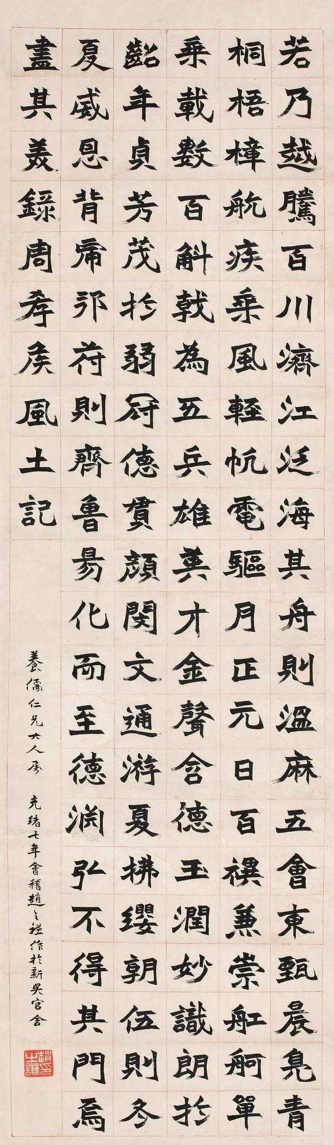 左下方的落款:“养儒仁兄大人属。光绪七年会稽赵之谦作于新吴官舍。”钤印白文一方“赵之谦印”,就是回文印。
