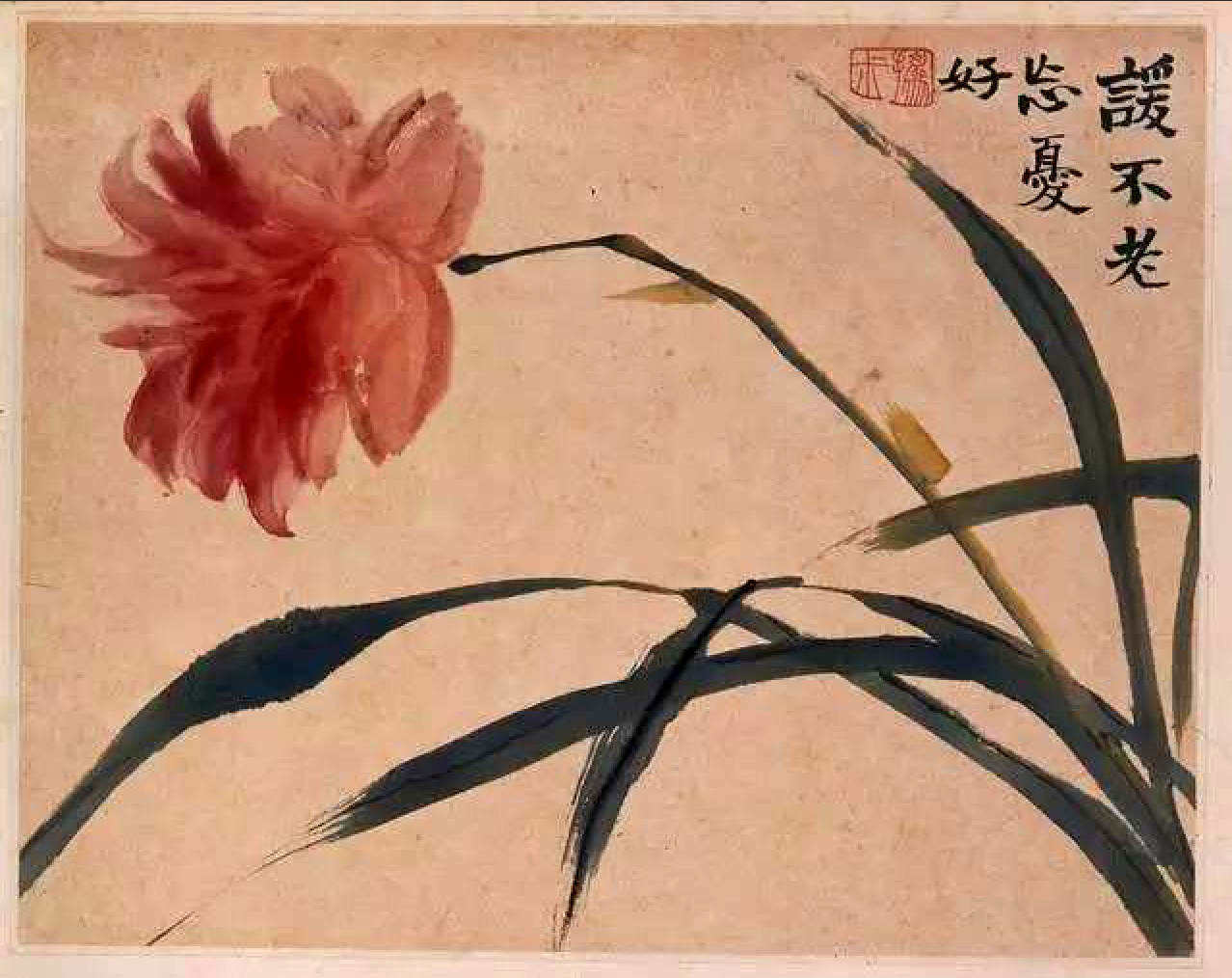 右上方落款:“谖不老忘忧好”,钤印朱文“撝叔”,就是赵之谦的“字印”。另外,字印有时可以加上姓氏,比如“姓某某”,也可以在姓后面加上“氏”字,作“姓氏某某”,也可以直接在“字”下面加“氏”,写作“某某氏”,还可以在字下面加“父”字,写作“某某父”,这里的“父”读作“甫”(fǔ),本是古代在男子名字下加的美称,后专指人的“表字”。我们经常见篆刻大师们刻印,有“某某父”,其实是“表字印”。此类表字印不再举例,遇到时了解就好。