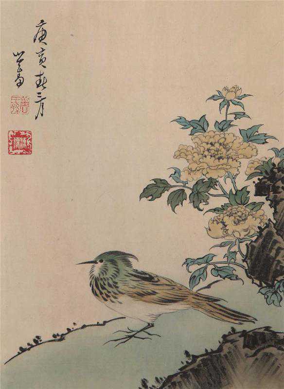 左上的落款:“庚寅(1950)春三月。心畬。”钤印两方上面朱文一方“旧王孙”,下面白文一方“溥儒”四灵印,“溥儒”是溥心畬的“名字”。