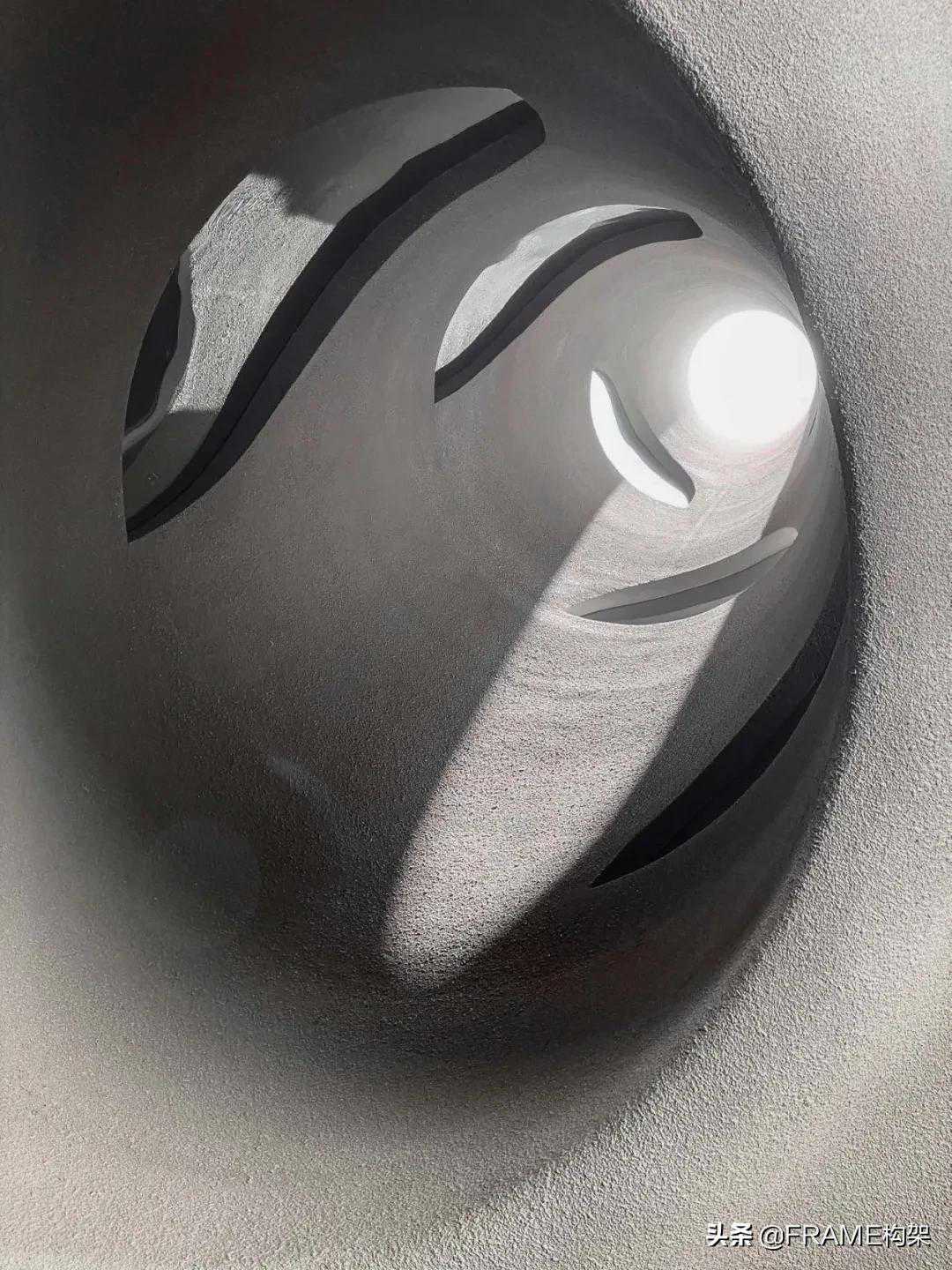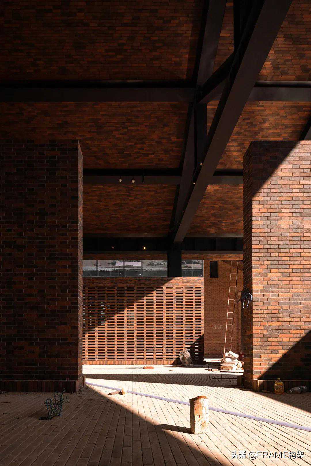 建筑整体基于“被动式设计”,通过东,南,西三向双层幕墙系统(陶砖网格+空腔+低辐射中空low-e钢化玻璃)最大幅度降低能耗,并以传统‘陶砖’结合现代幕墙结构设计呈递独特镂空砌筑效果。以“晾衣绳”为创作灵感的原创灯具产品则作为室内主体装置建立深层次的感官焦点,在浑然一体的室内空间与建筑中构成丰富、有纵深向的空间体验,同时亦暗合建筑与景观中的正圆/正弧。