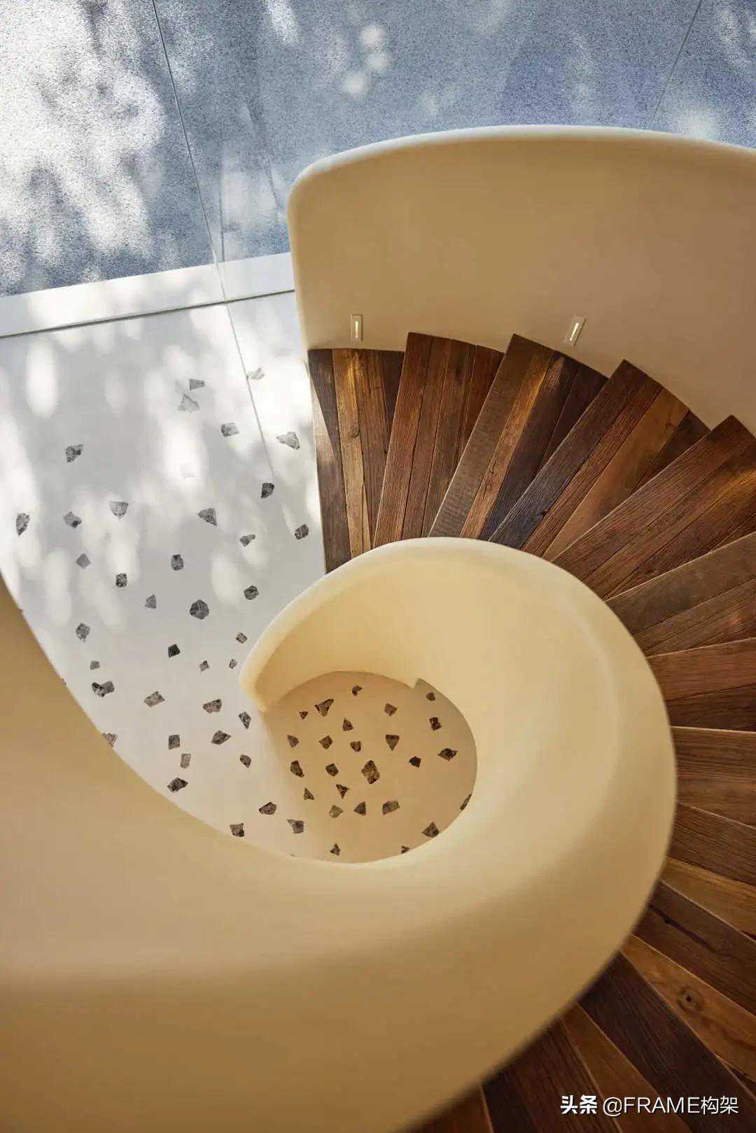 在空间营造中,设计师利用不同的肌理表达光、水、木、石等元素,让空间成为通透的自然容器。设计师在极为有限的垂直空间中设计了连接三层空间的旋转楼梯,具有力量感的体块和优雅的弧线结合,在光斑树影的映射之下,强化了空间的浪漫主义。