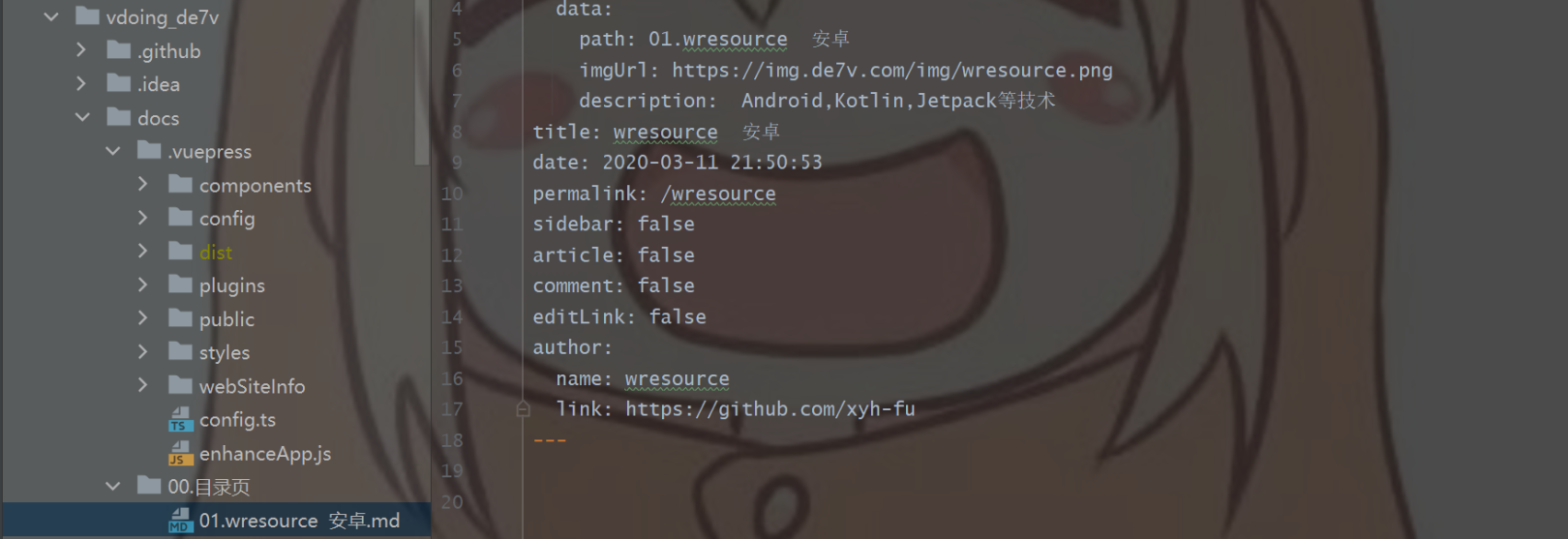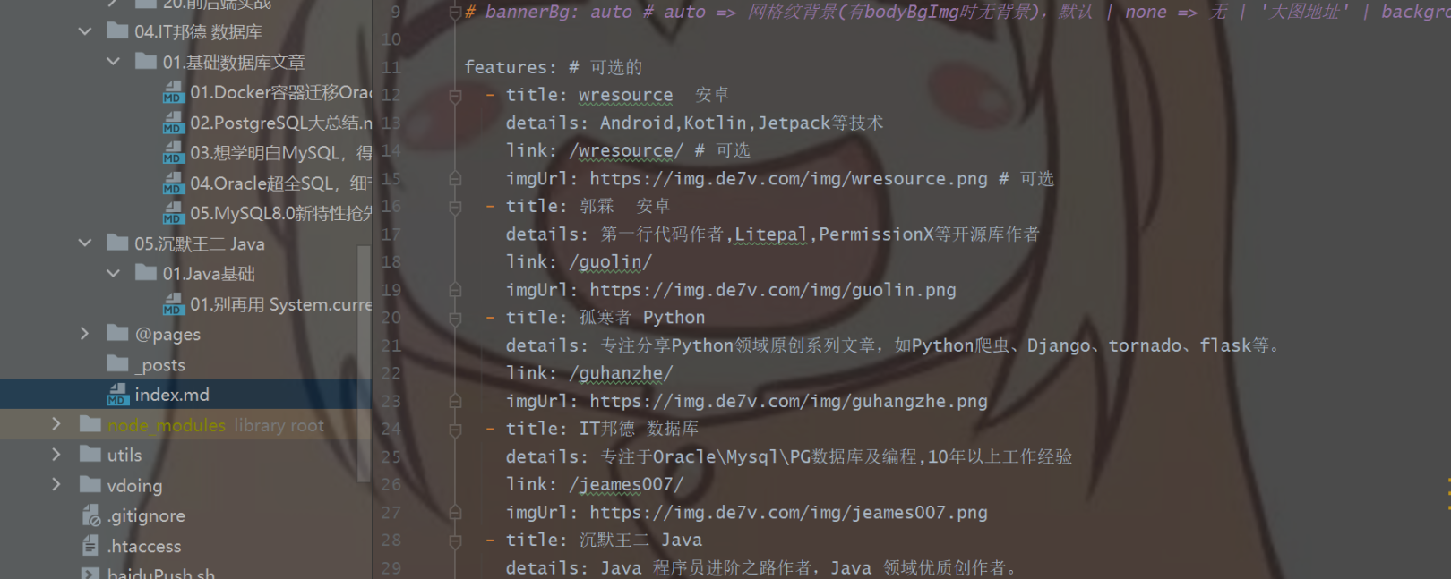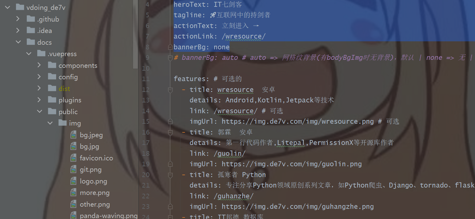 以下字段对应相关的图,可以自行体会一下,对应导航栏下面的几个字段,其中涉及使用URL引入的,可以替换成路径引用,具体字段帮助请自行查看fork过来的仓库介绍,也可以到Vdoing官方文档查阅.