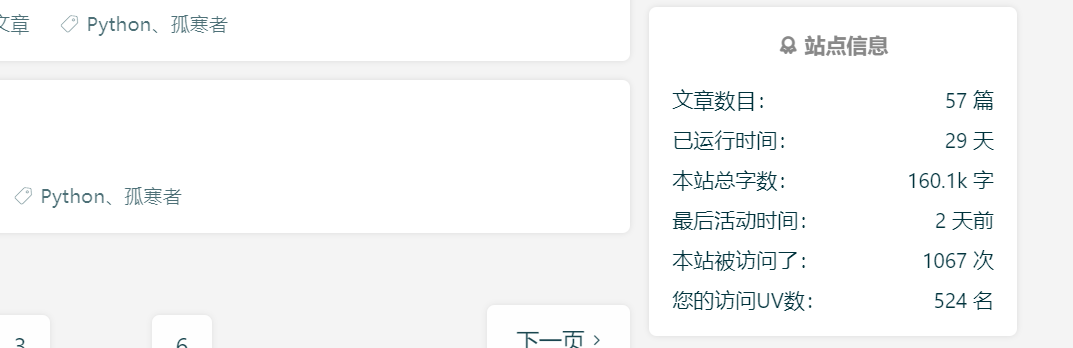 站点信息页面主要用于统计网站相关信息的功能同时也增加文章字数统计以及阅读量统计等等,这个配置参考kbt大大的博客,这里提醒一下readfile文件在博客中失效,建议去kbt大大的github项目主页获取最新的代码。站点信息搭建