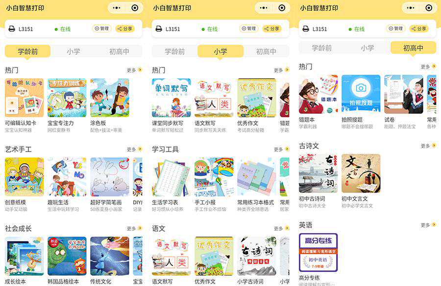 这款打印机不仅可以满足SOHO办公的需求,还可以全方位满足家庭用户。如果你里有孩子,这款打印机还能帮助你的孩子学习知识哦,小白打印小程序中不仅有着丰富的儿童读物和试卷考题内容,而且还将内容精细化的分为了学龄前,小学和初高中三个类别。不同年龄段的孩子分别对应不同的打印内容,所以这个小程序不光可以打印,还能让你家的孩子在学习方面更上一层楼。