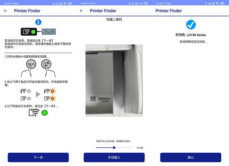 与爱普生L4168这类墨仓式®打印机有所不同,L3151并没有配备显示屏,不过可以通过手机或平板电脑下载PrinterFinder这款APP来无线连接这台打印机,并设置一些打印机的相关参数。配置打印机的整个过程有些偏长,大致需要10分钟左右,而在无线网络配置好后打印机会打印一张带有打印机电子邮箱地址和密码的微信打印说明书,邮箱地址下方的二维码是为微信小程序扫码绑定设备服务的。