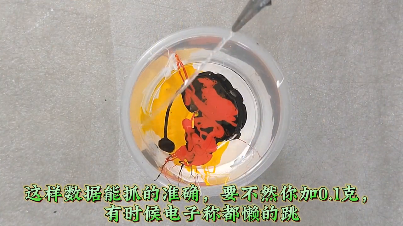 这种浅黄色怎么调?像这种极浅的颜色主要难在它里面含的红色、黑色,比例占的非常少,加的时候比较难把控。像一次调30-40克样油,里面红色、黑色就占0.1-0.2克。这种情况一般会把原色墨冲淡稀释10倍。就像我这里加的黑色、大红都是冲淡10倍再加进去,这样数据能抓的准确,要不然加0.1克有时候电子称都懒的跳。