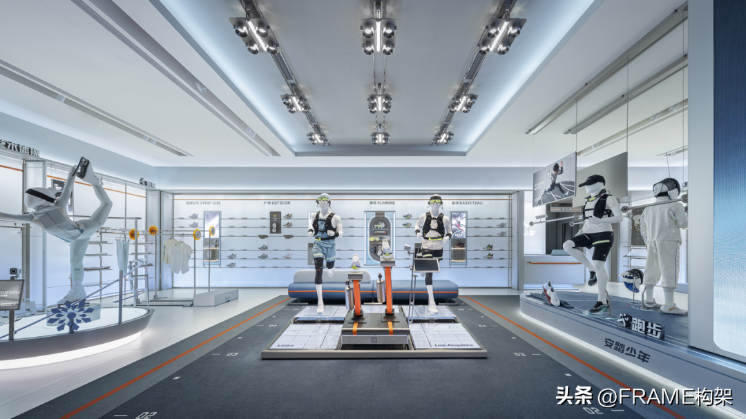 如安踏少年的全案设计,我们创新性地提出了“未来赛场”概念,统筹平面视觉和线下体验空间,这是一个人群定位更为聚焦和细分的项目,我们将科技与专业运动融入设计当中,采用轻量化的设计语言,减少硬核的运动感,强调不同于成人和儿童的自信和朝气的少年感,形成差异化,以提供更极致、聚焦的品牌体验。