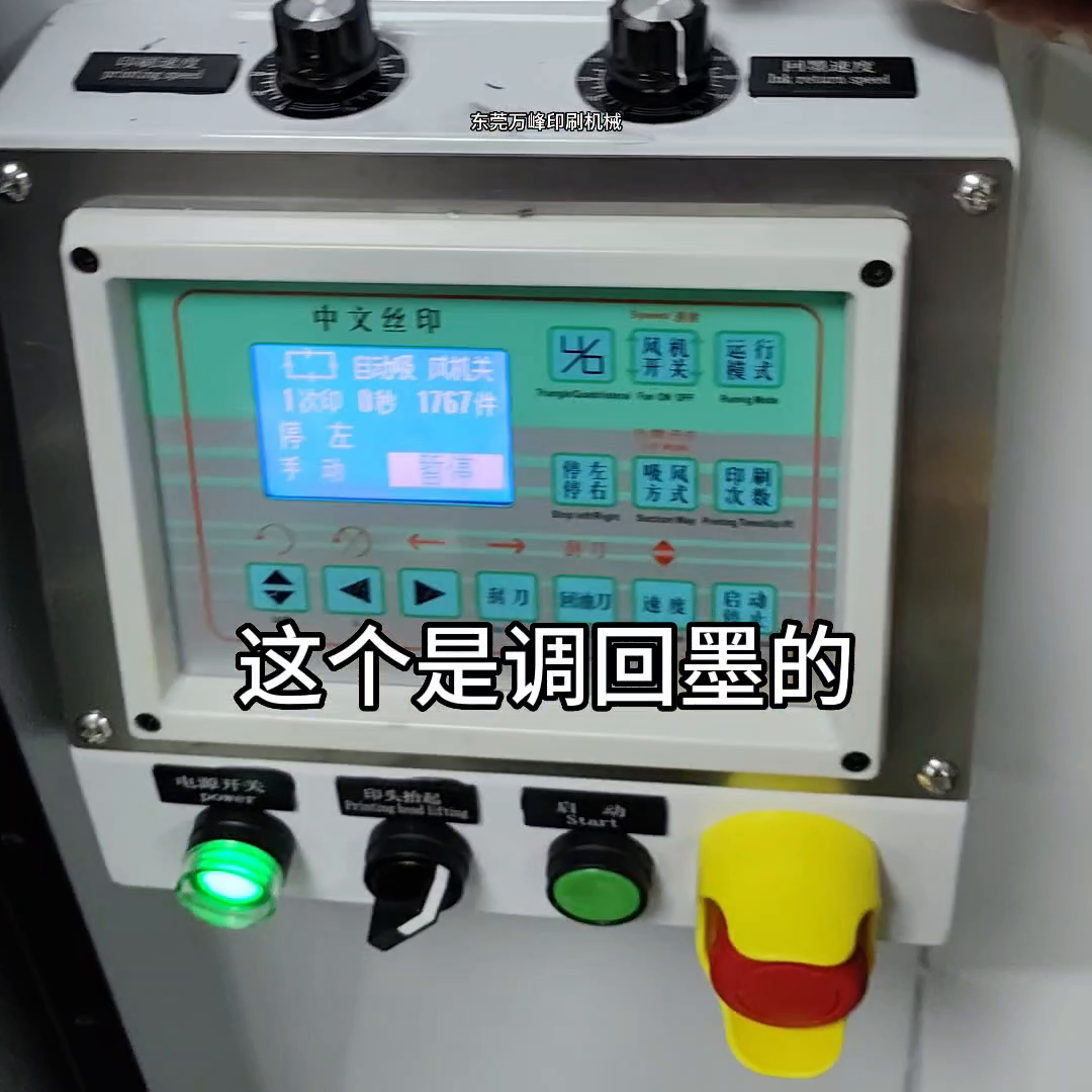 这个是调回墨的,这个是调印刷速度。这个是电源开关,这是抬头功能启动按,上下也可以调,工作台也可以调上下。因为这个比较大,要考虑到客人好调,各方面各个部位都要能调。其实也没有好介绍的,等一下我会送上网板。