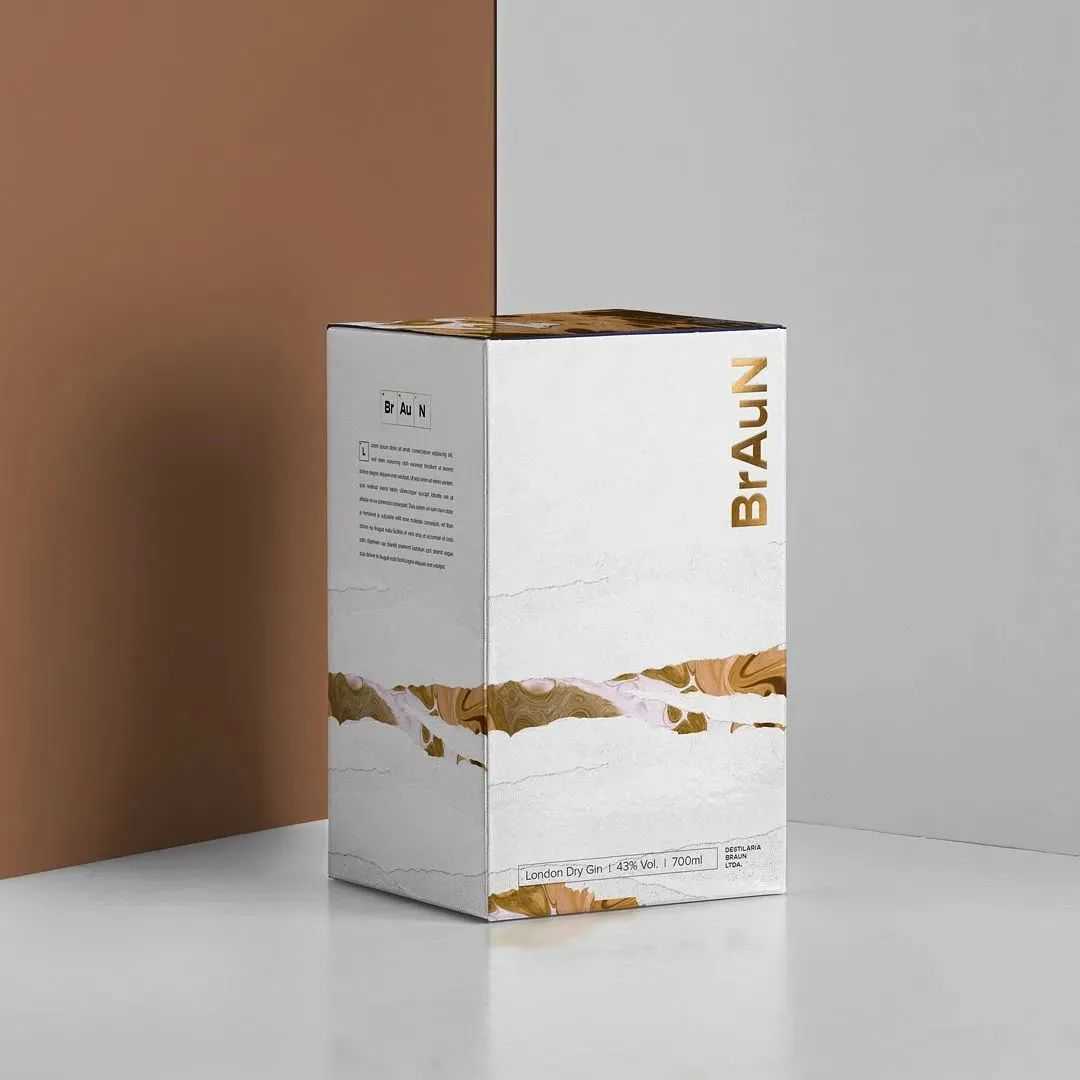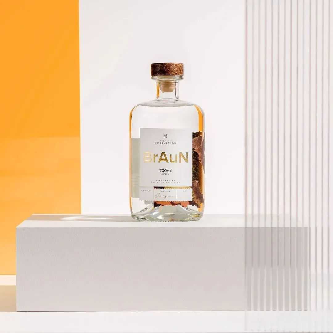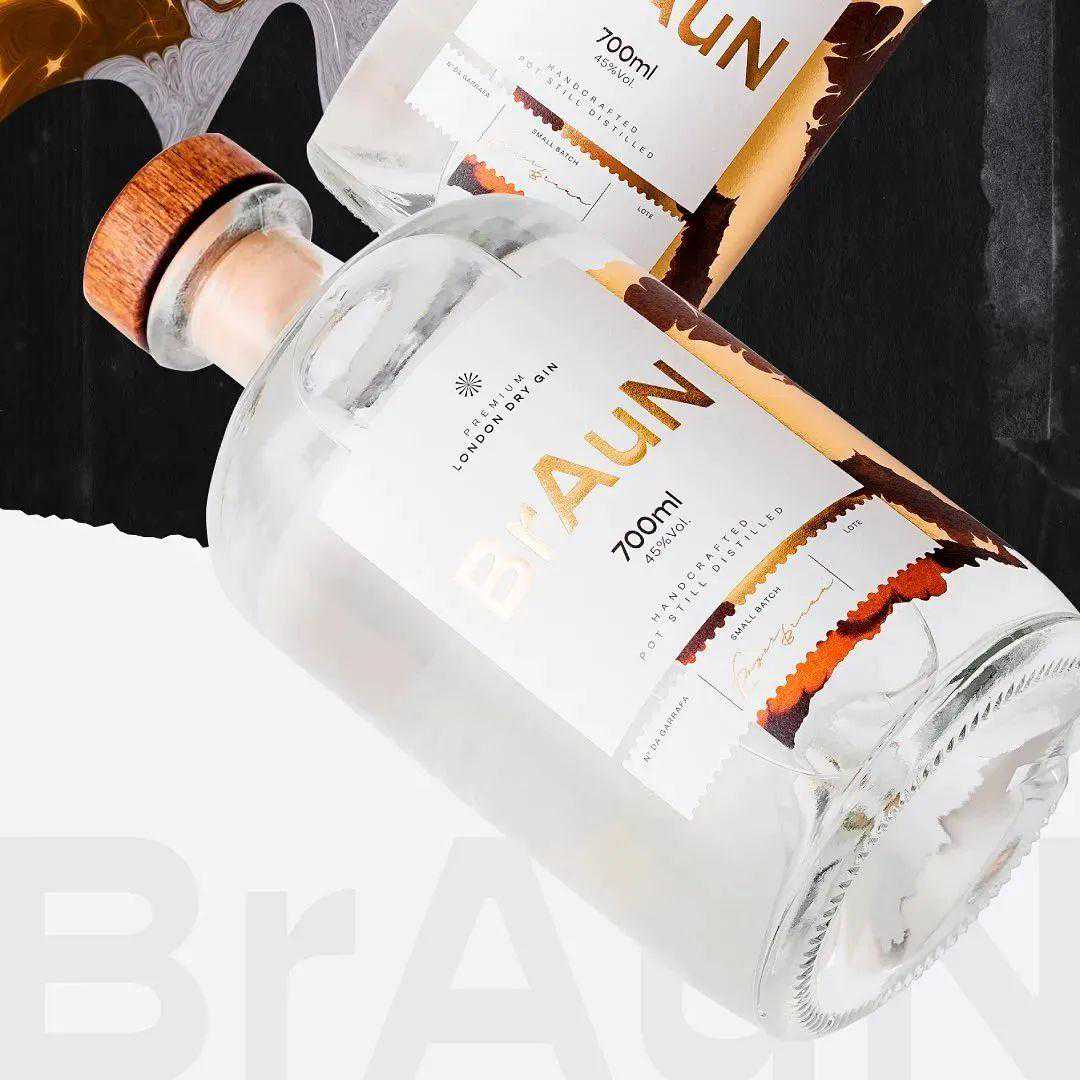 “Braun”是一个伦敦干金酒(LondonDryGin)品牌。酒的标签,选用了特种纸,印上抽象的纹路图案,并加入了大面积的烫金,给人以高品质的感受。