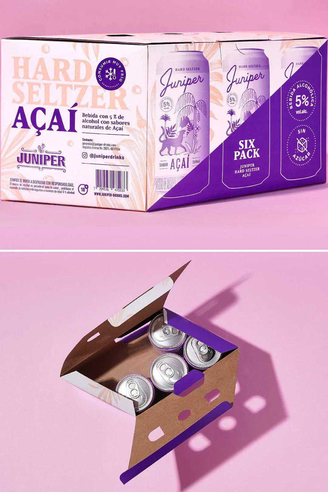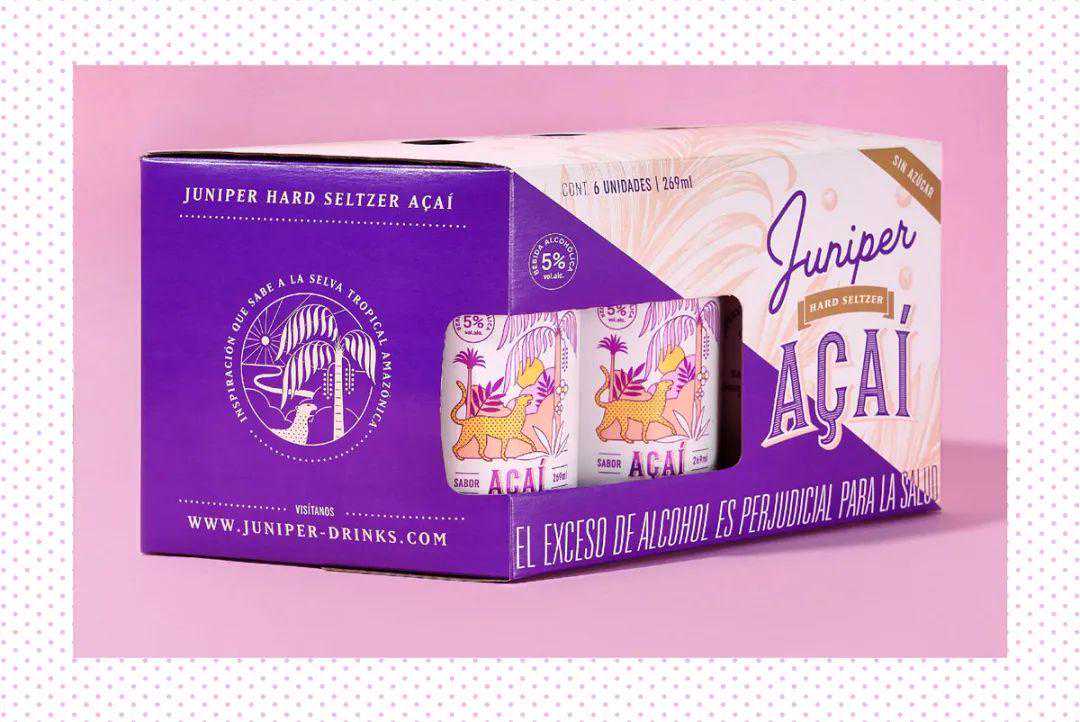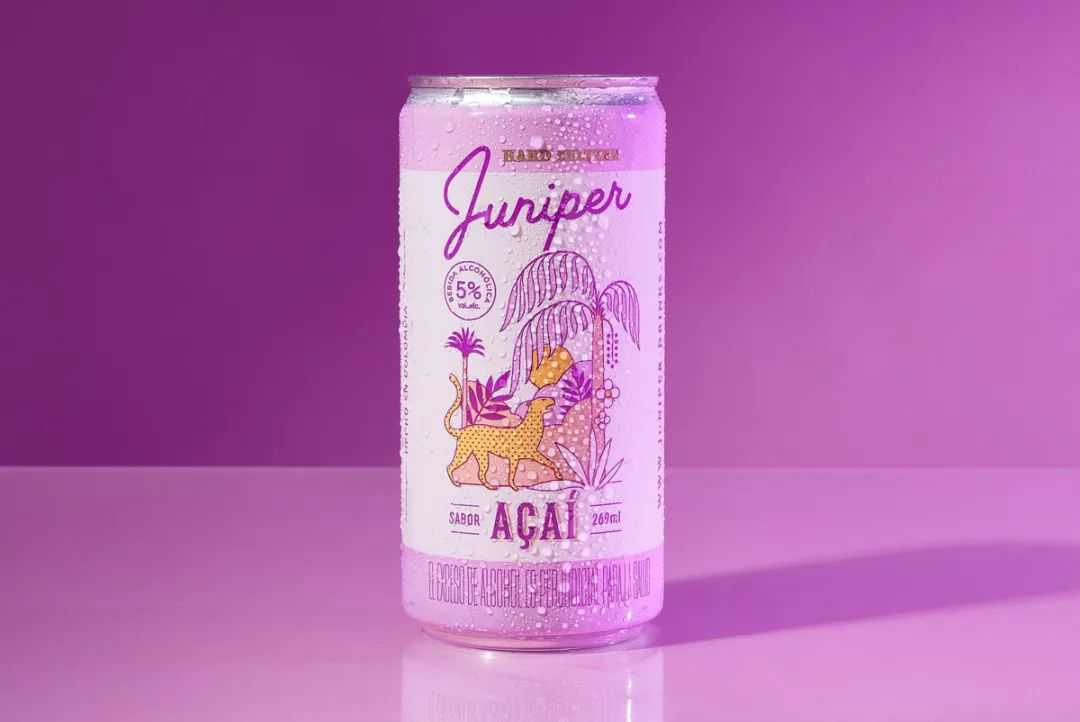Juniper是一款起泡饮料,这种饮料由碳酸水、水果调味品和低含量酒精制成。包装视觉描绘了亚马孙雨林的动植物群,给人一种热带清新的感觉,选择了与浆果相近的紫色配色,以配合即将推出的新口味。