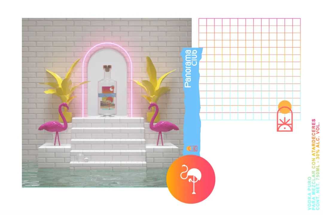 PANORAMACLUBVODKA是一款伏特加酒,品牌视觉采用充满色彩的风格,将伏特加与日落结合,添加火烈鸟、天空等元素,表现了休闲、浪漫、温暖的氛围。