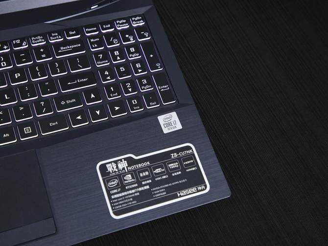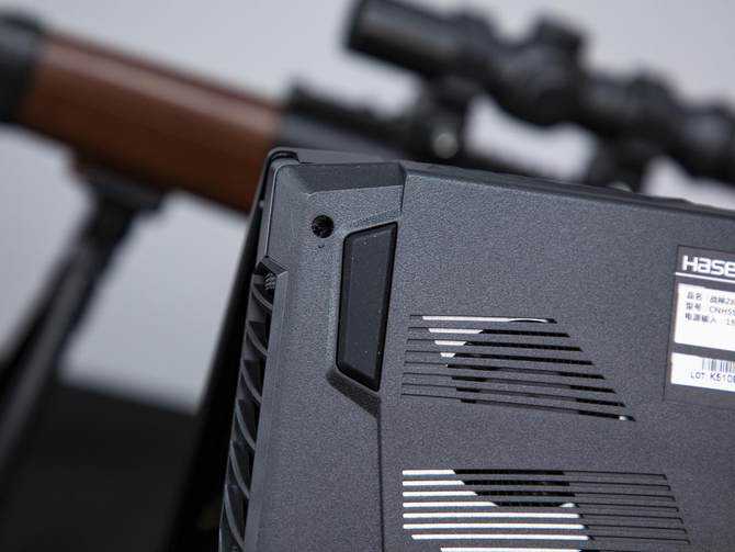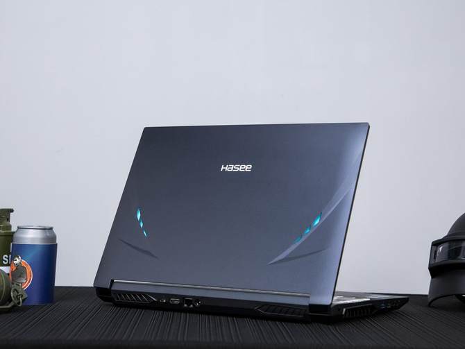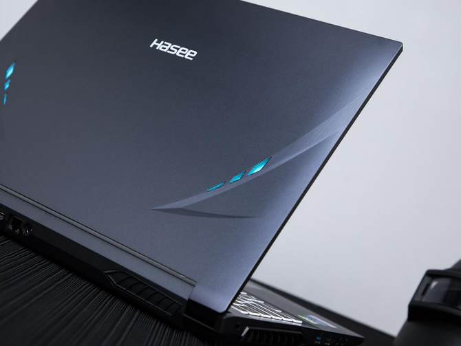 另外这款游戏本的A面的两侧采用了类似于机甲战士眼睛的设计,并且加上了蓝色LED灯光的点缀,科技风十足,同时搭配黑色的机身颜色,给人的感觉非常的战斗酷炫,同时在我们点亮屏幕的时候,LED将会自动点亮,造型非常的犀利。A面的正中间是神舟“HASEE”的品牌LOGO标识。