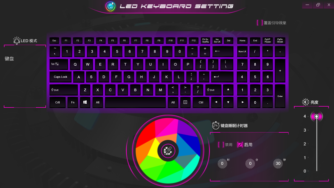 在C面,这款游戏本配备了RGB背光键盘,并且键盘的背光颜色我们可以通过内置的内置的软件进行自由调整,在软件内我们同样还可以设置键盘背光的亮度以及键盘背光休眠的时间,这款还是不错的,比较遗憾的就是键盘不支持分区RGB灯光调节。
