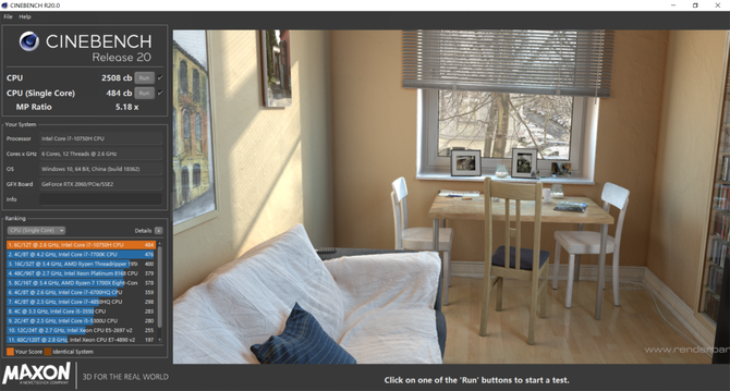 在CINEBENCHR15中CPU的多核心性能为1160cb,单核性成绩为207cb,同时在CINEBENCHR20中,这款游戏本的多核心成绩为2508cb,单核心成绩为484cb,表现优秀。