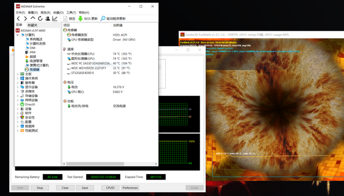 温度测试环节,我们使用AIDA64和“甜甜圈”进行双拷,通过近半个小时的拷机,整机的CPU温度稳定在74℃,显卡的温度为75℃,温度表现很好,同时掌托的温度也保持的很好,没有出现烫手的情况。